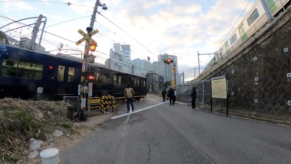 田端駅からはさらに坂を登ります。田端駅を背にすると江戸坂と呼ばれる坂が現れます。西側にほぼ直角に曲がるカーブを持つ坂道です。坂を登り北へ進むと山手線が再度出現します。この辺りが山手線の最北端になります。山手線唯一の踏切を渡ったあと線路沿いに西へ進むと駒込駅へ到着です。