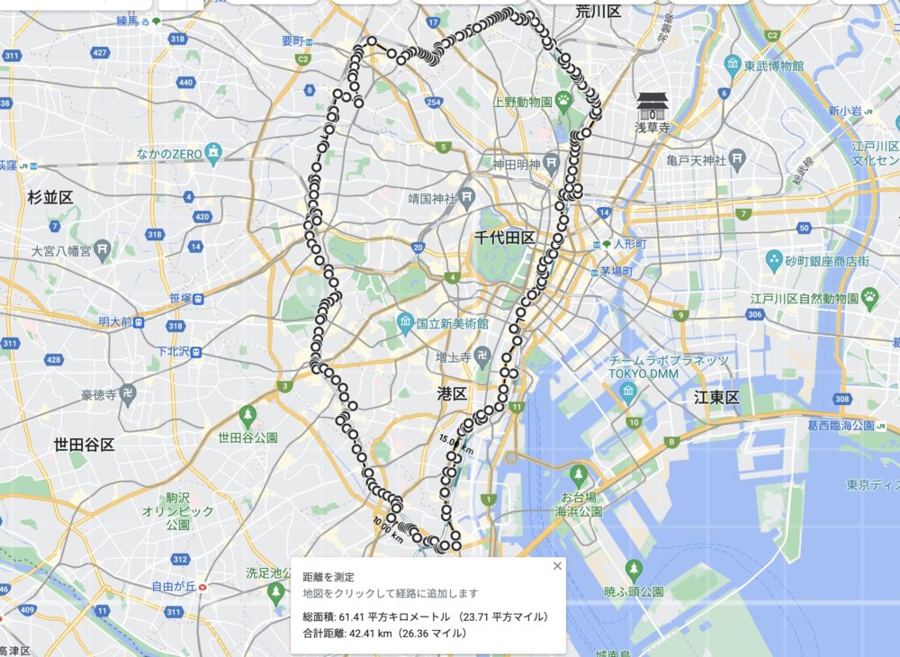 走行距離をGoogleマップで計測すると42.41Kmでした。山手線の全長が34.5Kmですので、実際の山手線より8Km弱多く走ることになりました。