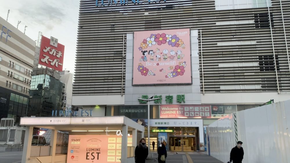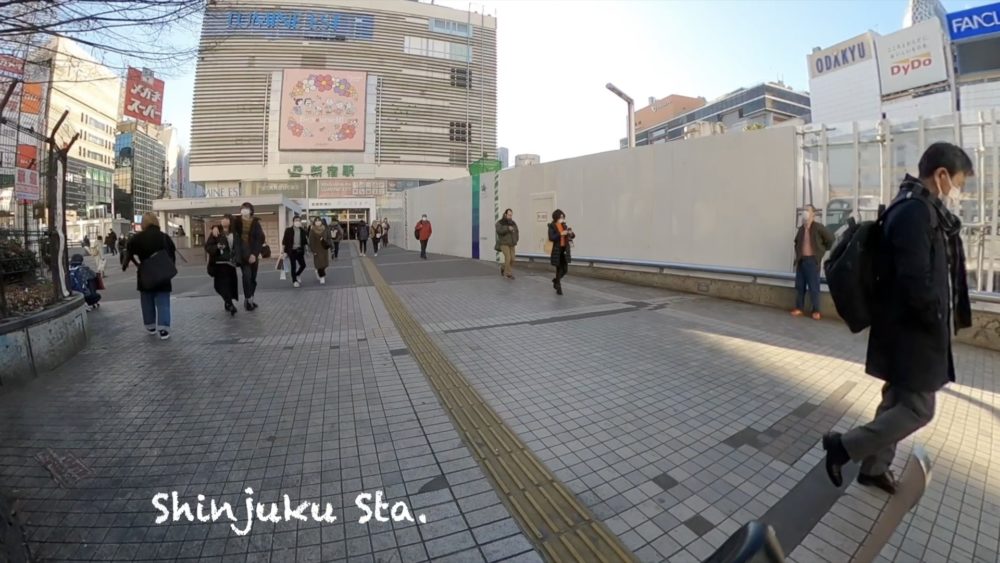 新宿駅東口をスタート地点とし山手線内回り一周の旅のスタートです。東口といえば昔は笑っていいとも!で有名なスタジオアルタがあります。最近だと、クロス新宿ビジョンの3Dの猫が話題です。クロス新宿ビジョンは7:00より開始で「猫が眠りから覚める」貴重な?バージョンをひと通り見てからスタートしました。ですので厳密には7:04のスタートとなりました。思い出横丁へ抜ける地下道を通って西口方面に抜けてから代々木駅方面を目指します。