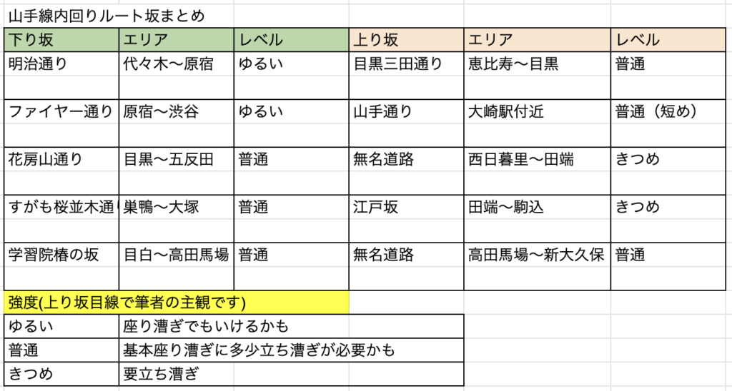 ところどころ出てくる坂道についてまとめてみました。内回りでまとめましたので、外回りでチャレンジされる方は上り坂と下り坂は逆になります。坂の強度はあくまで私の走った感想になります。実際に傾斜等は計測していませんのでご容赦ください。また大崎駅を過ぎて西日暮里までは驚くほどフラットな道でした。