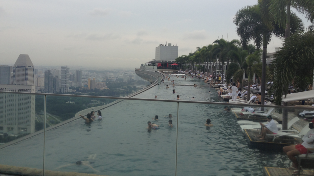 GREEN SPRINGSの階段を登ると木々の緑と水の流れる音が私たちを迎え入れてくれます。目の前の建物は屋上にインフィニティプールを備えた立川SORANO HOTEL。立川のマリーナベイサンズになれるか?右側写真は私が2014にマリーナベイサンズに泊まったさいの写真です。