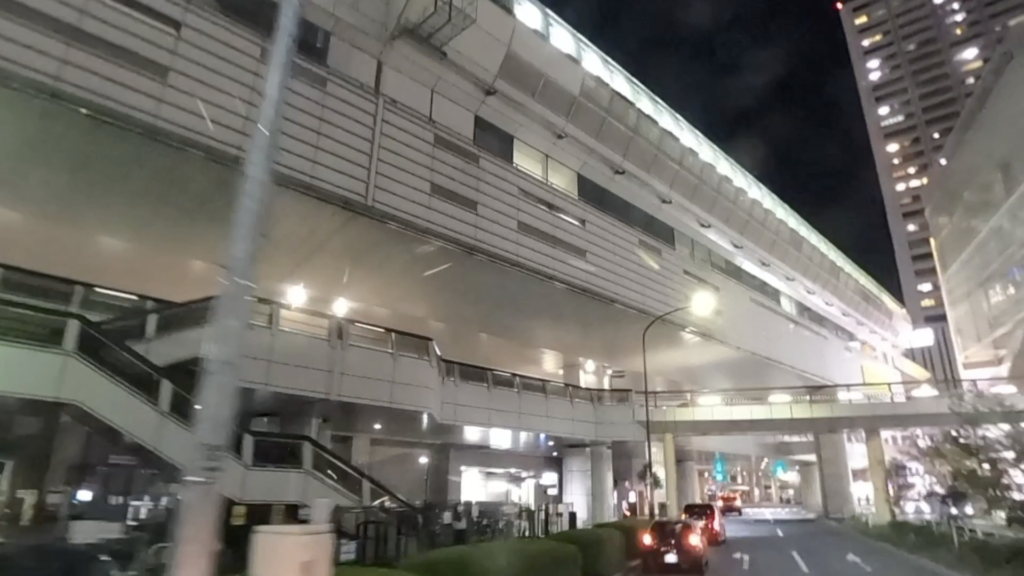 砂川七番駅方面から立飛駅方面に向かうモノレール下を走る映像となります。左側には夜のららぽーと立飛が見えます。立川駅方面の明かりが賑わいを感じさせてくれます。