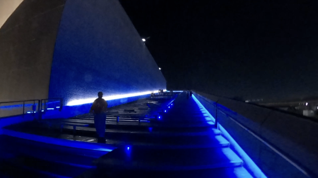 天空に伸びるような階段です。夜になるとライトアップされていて天空感がさらに増します。階段の左半分は水が流れています。
